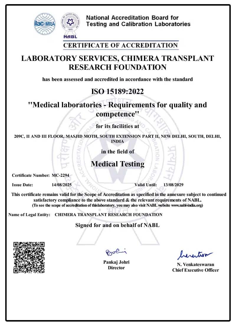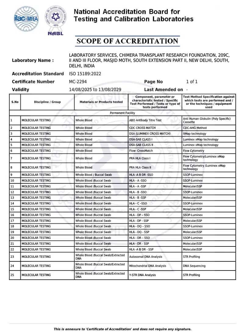 DNA Forensics Laboratory works in partnership with Chimera Transplant Research Foundation which has been accessed and accredited in accordance with the standard ISO 15189:2012 in the field of medical testing by NABL and ILAC/MRA.